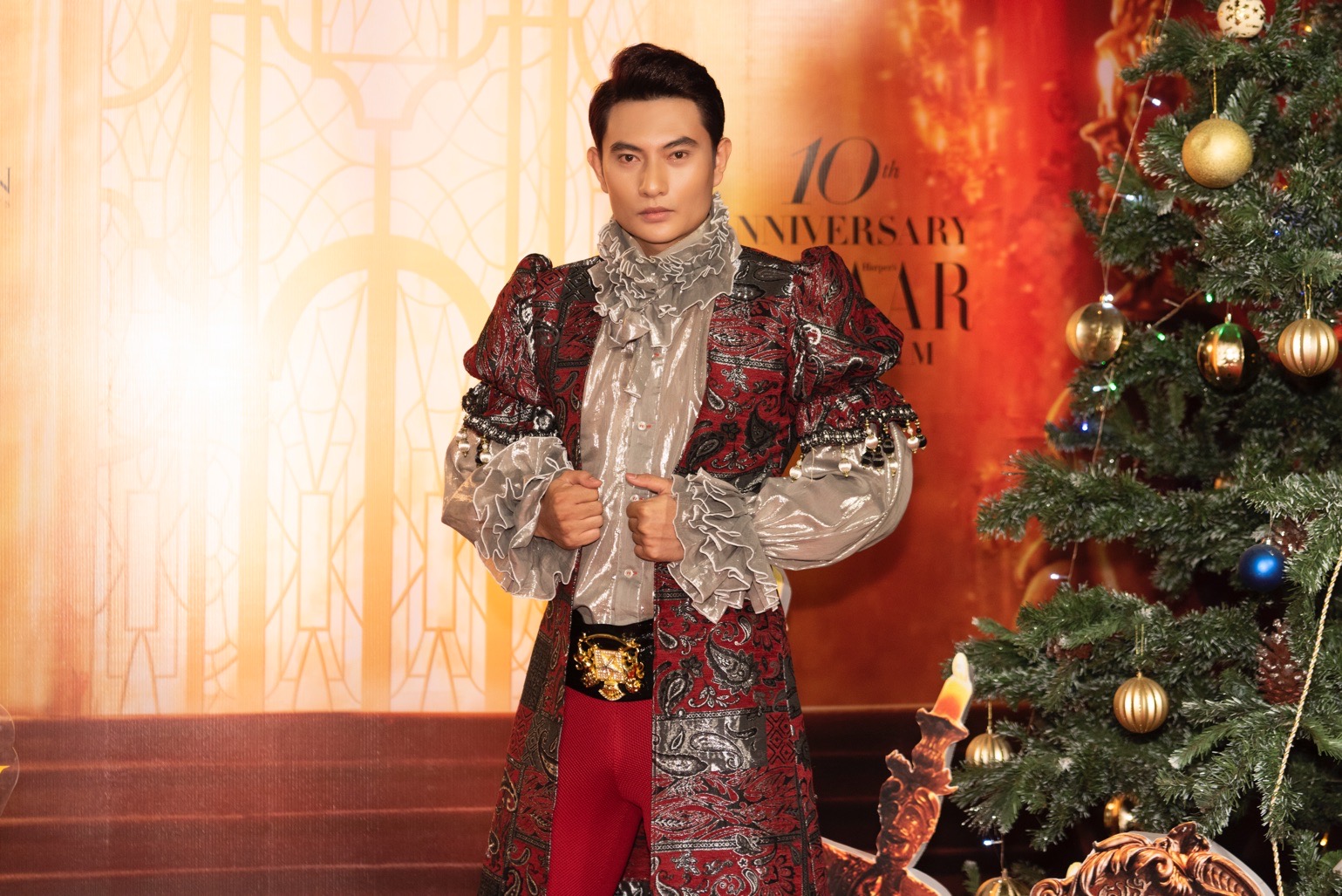 Dresscode lấy chủ đề hoàng gia châu u sang trọng, Mister Việt Nam Minh Quyền đã hoá thân thành chàng hoàng tử lịch lãm trong bộ trang phục của NTK Nguyễn Dũng. Nam vương Việt Nam sở hữu chiều cao ấn tượng 1m88 đã khiến nhiều khách mời trong đêm tiệc Giáng Sinh phải trầm trồ khen ngợi. Không những vậy, anh còn có gương mặt góc cạnh toát lên vẻ nam tính, khi khoác lên mình bộ u phục Hoàng gia càng làm tăng thêm vẻ sang trọng, rất phù hợp với không khí của sự kiện trang trọng này.
